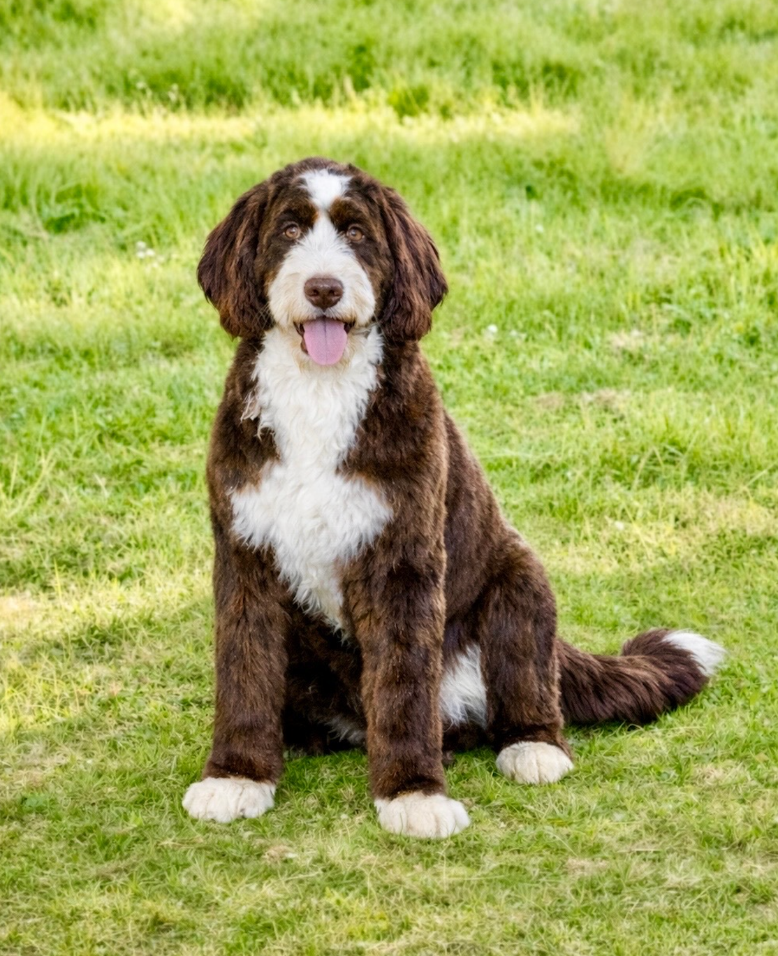 Coco is a truly unique and beautiful chocolate Bernedoodle with a wonderful, well-balanced temperament. She loves spending time with her little human friends and enjoys roaming the property exploring. One of her favorite activities is running alongside the horses during trail rides. Coco has a stunning rich chocolate coat and exceptional coat genetics. She produces puppies with either straight furnished or loose wavy furnished coats and will not produce tight curly coats. This makes her puppies especially desirable for families looking for a softer, more relaxed coat texture that is less poodle-like while still maintaining excellent non-shedding genetics, making them a wonderful option for allergy-sensitive homes